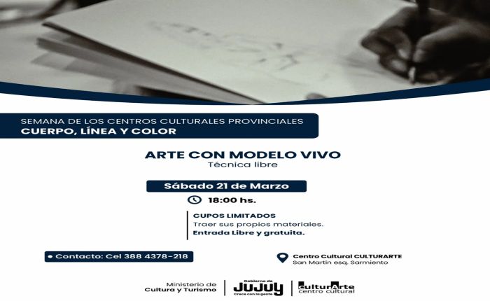 El Centro Cultural CulturArte de San Salvador de Jujuy invita este sábado 21 de marzo a una sesión de dibujo con modelo vivo en técnica libre, en el marco de la Semana de los Centros Culturales Provinciales «Cuerpo, Línea y Color». La actividad comienza a las 18:00 en la sede del centro, ubicada en San Martín esquina Sarmiento.