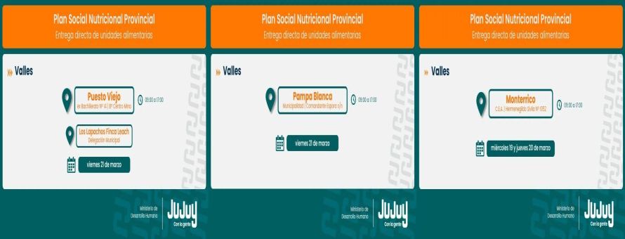El Ministerio de Desarrollo Humano, a través de la Secretaría de Asistencia Directa, comunica que desde el miércoles 19 de marzo se concretará la entrega del Programa “Comer en Casa”, a familias de Monterrico, Aguas Calientes, Pampa Blanca, Puesto Viejo y San Antonio.