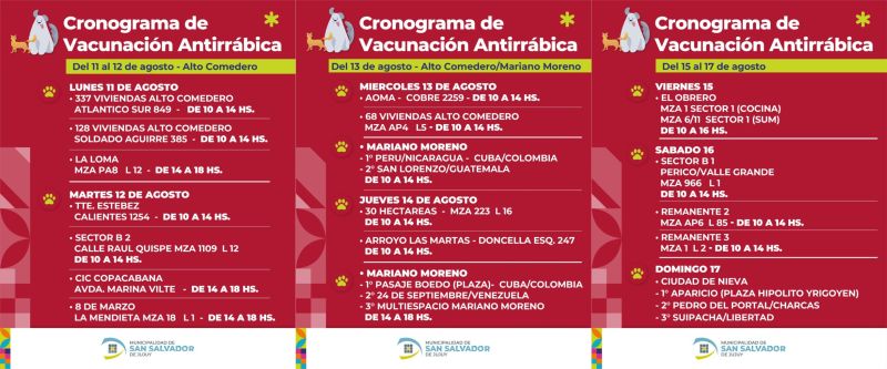 La Municipalidad de San Salvador de Jujuy, a través de la Dirección de Zoonosis, informó el cronograma de vacunación antirrábica gratuita para perros y gatos que se llevará a cabo del lunes 11 al domingo 17 de agosto en distintos barrios de la ciudad.
