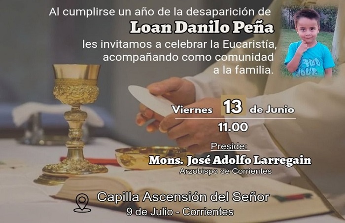 «El 13 de junio se cumple un año sin que la familia de Loan Peña pueda abrazarlo», describe la convocatoria a la misa por el primer aniversario de la desaparición del niño en la provincia de Corrientes.