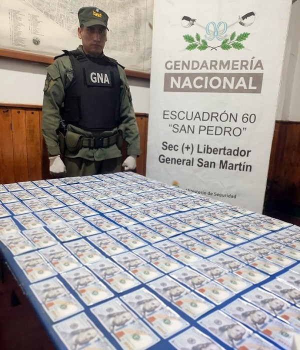 Los funcionarios hallaron adheridos a sus cuerpos fajos con billetes ocultos bajo sus prendas. Peritos de Criminalística y Estudios Forenses, confirmaron que se trataba del traslado de 11.600 U$S en billetes apócrifos.