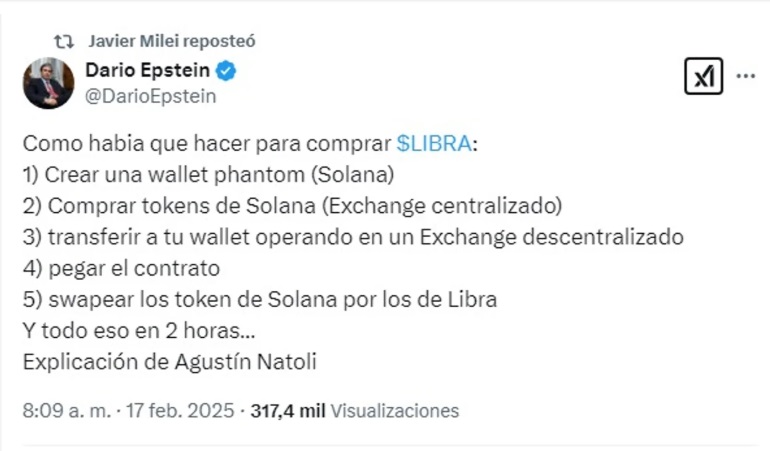 En medio de este contexto, el presidente Javier Milei reposteó un instructivo en su cuenta de Twitter sobre cómo comprar la moneda digital, generado por Darío Epstein, que detallaba los pasos para adquirir $LIBRA en un proceso que involucraba varias plataformas y billeteras virtuales.