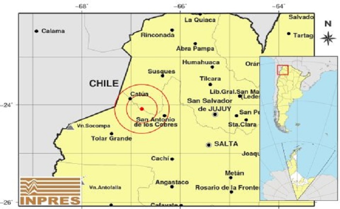 El epicentro fue a 27 kilómetros al Sureste de la localidad de Cátua; 54 kilómetros al Oeste de San Antonio de los Cobres y a 76 kilómetros al Suroeste de la localidad de Súsques.