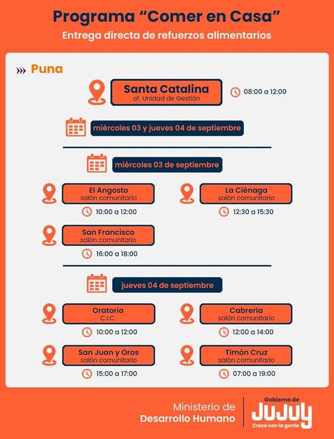 El Ministerio de Desarrollo Humano de Jujuy por medio de la Secretaría de Asistencia Directa, informa que los días miércoles 3 y jueves 4 de septiembre, se llevará a cabo la entrega de módulos alimentarios del Programa “Comer en Casa”, a las familias de Santa Catalina.