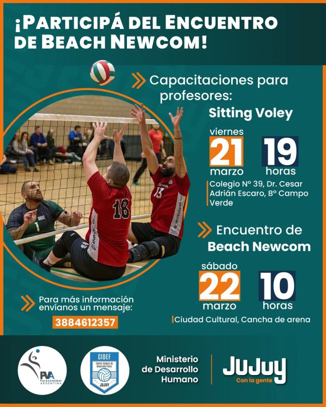 El Ministerio de Desarrollo Humano de Jujuy, a través de la Secretaría de Desarrollo Integral y la Coordinación de Calidad de Vida, llevará a cabo la capacitación para profesores en Sitting Vóley y el Encuentro de Beach Newcom.