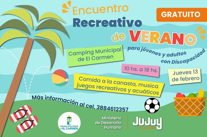 La Secretaría de Desarrollo Integral del Ministerio de Desarrollo Humano invita a las instituciones que trabajan con jóvenes y adultos con discapacidad a participar del Encuentro Recreativo de Verano que se realizará el jueves 13 de febrero de 10 a 18 horas en el Camping Municipal de El Carmen.