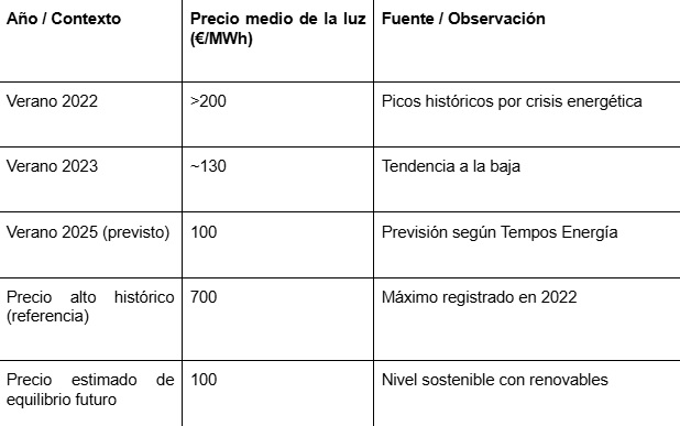 El precio de la luz ha sido uno de los principales temas de preocupación económica en los últimos años. Sin embargo, las previsiones para el verano de 2025 reflejan un panorama más optimista. Según la consultora Tempos Energía, especializada en asesoramiento estratégico energético, el coste medio del mercado mayorista podría situarse alrededor de los 100 €/MWh, un umbral que marca un cambio significativo frente a los picos históricos registrados en 2022.