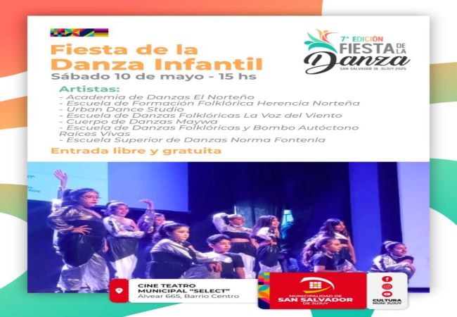 La Dirección de Cultura del municipio capitalino continúa celebrando la 7ma. edición de la Fiesta de la Danza, un evento cultural que se extenderá durante todo el mes de mayo con diversas actividades gratuitas en distintos espacios de la ciudad. En ese marco, se llevará a cabo la Fiesta de la Danza Infantil en el Cine Teatro Municipal Select el sábado 10 de mayo a partir de las 15 horas con la presentación de diversos ballets y espectáculos en vivo.