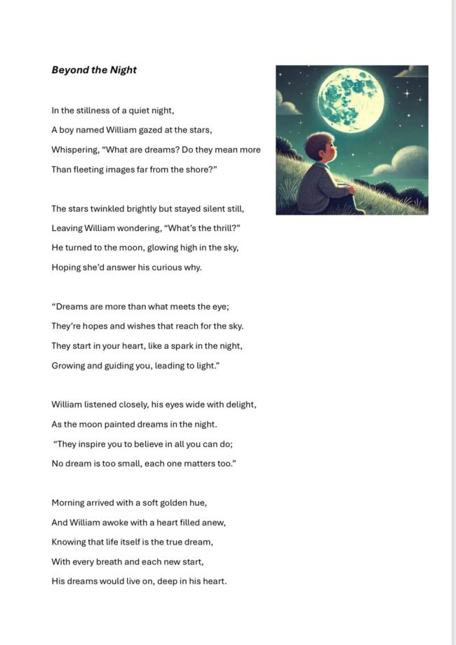 La poesía que escribió Lucía cuenta la historia de William, un niño que una noche tranquila le pregunta a la luna: “¿Qué son los sueños?, ¿significan algo más que imágenes fugaces?” Entonces, ésta le responde: “Los sueños son más de lo que parecen; son esperanzas y deseos que llegan hasta el cielo. Comienzan en tu corazón, como una chispa en la noche, creciendo y guiándote, conduciendo a la luz”.