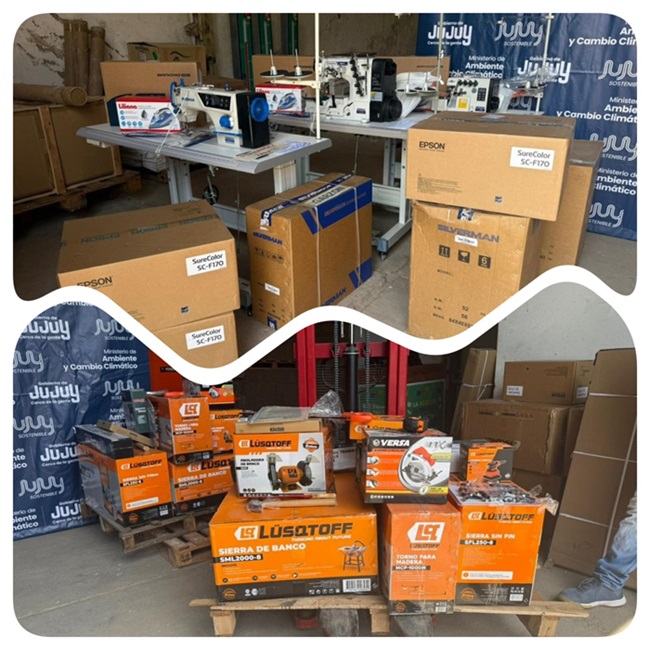 La titular de la cartera ambiental estuvo acompañada por los equipos de la Dirección de Políticas Socioambientales y de la Unidad de Implementación del Proyecto GIRSU Jujuy. Entregó herramientas, maquinarias y equipamientos destinados a diversos emprendimientos del rubro carpintería y textil, para que se puedan desarrollar productos, comercializarlos y de esta manera generar ingresos y fuentes de trabajo. Recibieron Carlos Dante Méndez, Fabio Félix Mamani, Paulina Choque, María Eugenia Garzón, María Inés Zarate, y Lucila del Carmen Fernández.