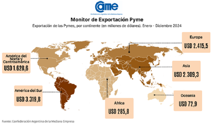 Así surge del Monitor de Exportación Pyme (MEP) –indicador elaborado por el sector de Estadísticas e Informes de la Confederación Argentina de la Mediana Empresa (CAME)– para medir las exportaciones de las pequeñas y medianas empresas de la República Argentina, en base al monitoreo mensual de las operaciones de las empresas argentinas en el comercio exterior, discriminando por su condición pyme declarada ante la Secretaría de la Pequeña y Mediana Empresa, Emprendedores y Economía del Conocimiento, dependiente del Ministerio de Economía de la Nación.
