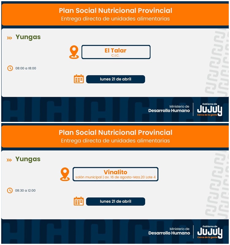 El Ministerio de Desarrollo Humano de Jujuy, por medio de la Secretaría de Asistencia Directa, comunica que desde el lunes 21 de abril, se concretará la entrega de refuerzos alimentarios del Programa “Comer en Casa”, a familias de Palma Sola, Vinalito y El Talar.