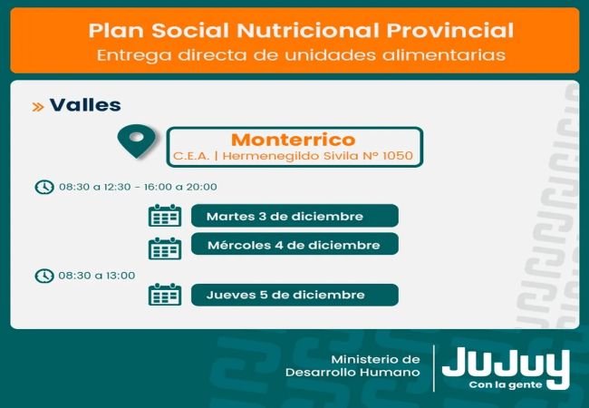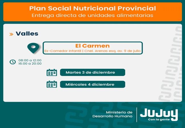 El Ministerio de Desarrollo Humano de Jujuy, mediante la Secretaría de Asistencia Directa, comunica que desde el martes 3 de diciembre se llevará a cabo la entrega directa de las unidades alimentarias del Programa “Comer en Casa” a familias de El Carmen, Monterrico y La Esperanza.