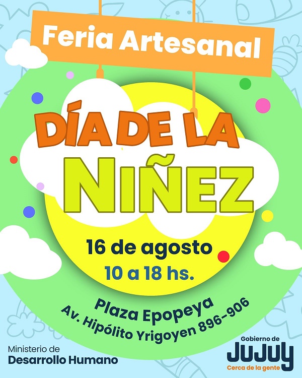 El Ministerio de Desarrollo Humano de Jujuy, a través de la Secretaría de Desarrollo Integral y la Coordinación de Economía Comunitaria, invita a la comunidad a participar de una Feria Artesanal por el Día de la Niñez, que se realizará el sábado 16 de agosto de 10 a 18 horas en la Plaza Epopeya, ubicada en Av. Hipólito Yrigoyen 896-906, de la ciudad capital.