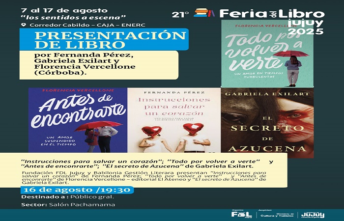 La Feria del Libro Jujuy “Los sentidos a escena” se prepara para vivir una de sus jornadas más destacadas, este sábado 16 de agosto, las reconocidas escritoras Fernanda Pérez, Florencia Vercellone y Gabriela Exilart llegarán a San Salvador de Jujuy para compartir con el público charlas, reflexiones y la presentación de sus obras más recientes.