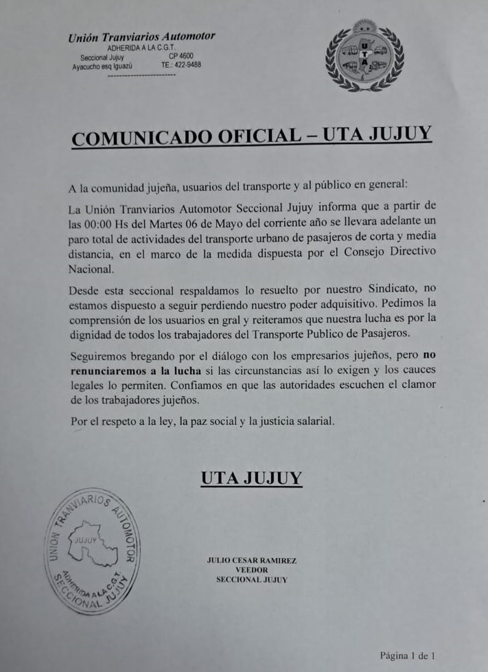En estos momentos y extraoficialmente fuentes de la seccional Jujuy confirmaron que si se adhiere a esta medida resuelto por UTA y que no habrá colectivos tanto urbanos y de media distancia este martes 6 de mayo por 24 horas en el ámbito provincial.