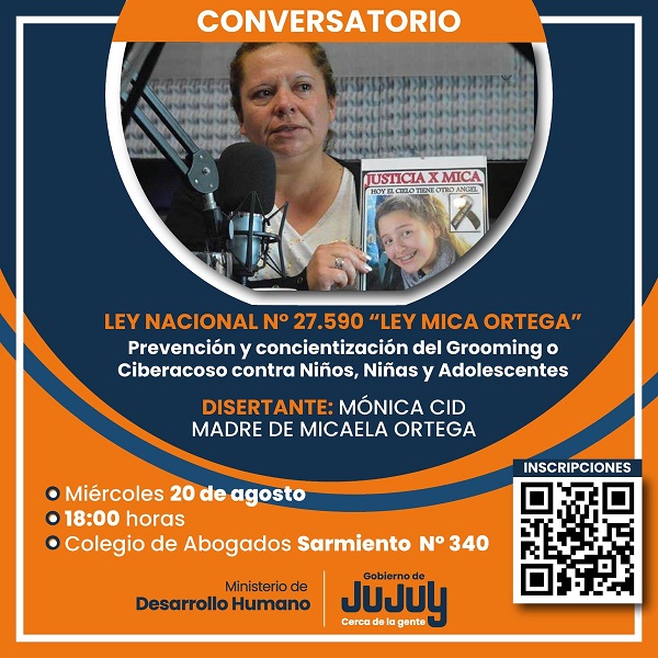 El Ministerio de Desarrollo Humano de Jujuy, a través de la Secretaría de Niñez, Adolescencia y Familia, invita a participar del Conversatorio “Ley Mica Ortega”, un espacio de reflexión y concientización sobre la prevención del grooming o ciberacoso contra niños, niñas y adolescentes.