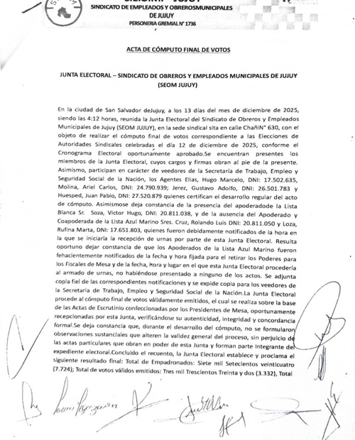 La Junta Electoral informa a todos los afiliados y al público en general el resultado del escrutinio definitivo de la elección general de autoridades del SEOM Jujuy, llevada a cabo el día de ayer 12 de diciembre del 2025.