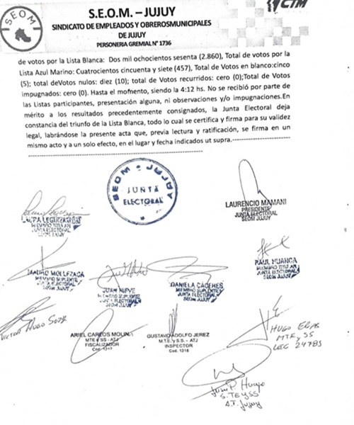En consecuencia, la Junta Electoral deja constancia del triunfo de la Lista Blanca, todo lo cual se certificó y firmó para su validez legal por los integrantes de la misma y por el cuerpo de veedores (un inspector regional de Fiscalización y tres veedores fiscalizadores) de la Secretaría de Trabajo de la Nación, que estuvo presente desde la apertura de urnas hasta el cómputo final y que certificaron el desarrollo regular del cómputo final.