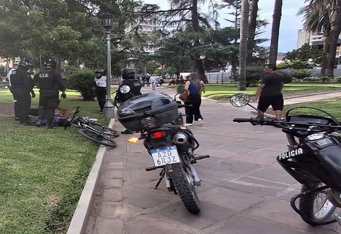 La intervención se produjo tras un pedido de apoyo en la intersección de calles San Martín y Gorriti, donde el sujeto exigía dinero de manera agresiva y profería insultos a quienes circulaban por la zona. Las unidades motorizadas actuaron de inmediato para restablecer el orden y garantizar la seguridad de los peatones.