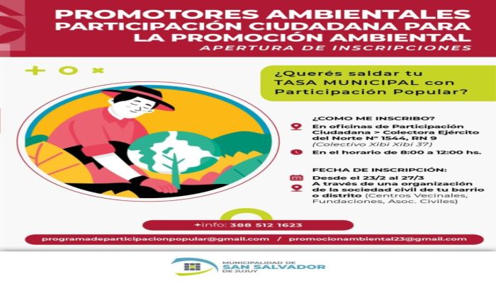La Dirección de Participación Ciudadana de la Municipalidad informó que hasta el viernes 27 de marzo, en el horario de 8 a 12, se realizará la inscripción para vecinos interesados en regularizar deudas por tasas e impuestos municipales a través del programa “Promotores Ambientales”, correspondiente al período 2026.