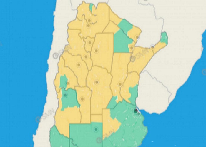 Se trata de un alerta amarillo que sigue en zonas de las provincias de Buenos Aires, Entre Ríos, Corrientes, Misiones, Formosa, Chaco, Santa Fe, Santiago del Estero, Córdoba, La Pampa, San Luis, Mendoza, San Juan, La Rioja, Catamarca, Salta, Jujuy y Tucumán.