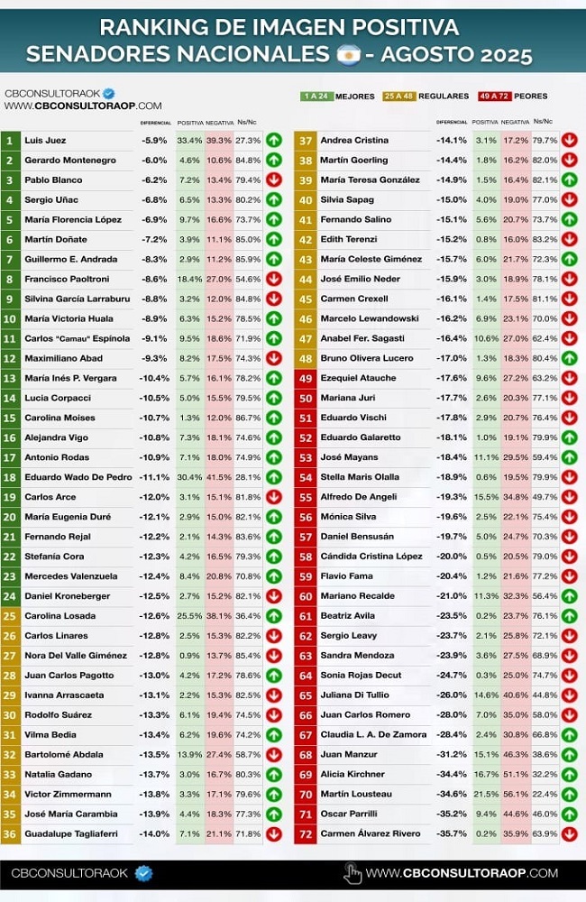 De este informe se desprende que los tres senadores nacionales con mejor diferencial de imagen en el mes de agosto 2025 son: en primer lugar, Luis Juez de Córdoba con un diferencial de -5,9%; seguido por Gerardo Montenegro de Santiago del Estero con -6,0%; y en tercer lugar Pablo Blanco de Tierra del Fuego con -6,2%.