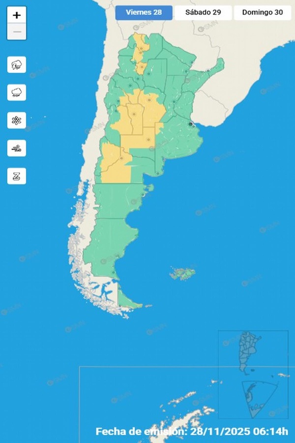 El Servicio Meteorológico Nacional (SMN) volvió a lanzar alertas por diferentes eventos climáticos adversos como tormentas fuertes y posible caída de granizo, fenómenos que impactarán en una gran extensión del territorio nacional durante la jornada de este viernes.