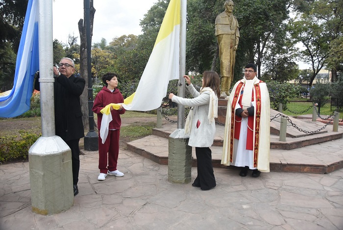 Las actividades programadas se iniciaron en plaza Manuel Belgrano, con el izamiento de la Bandera Nacional y la Bandera Papal, encabezado por el vicegobernador Alberto Bernis, el intendente Julio Bravo, la legisladora provincial Gisel Bravo acompañados por estudiantes, autoridades provinciales, municipales y fuerzas de seguridad.