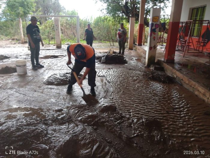 Ante esta situación, el equipo de emergencia municipal se trasladó hasta el sector para colaborar con tareas de limpieza y acondicionamiento del edificio escolar con el objetivo de restablecer las actividades educativas. Las tareas incluyeron la remoción de barro acumulado en el patio y en diferentes espacios del establecimiento, permitiendo que los alumnos puedan retomar las clases.