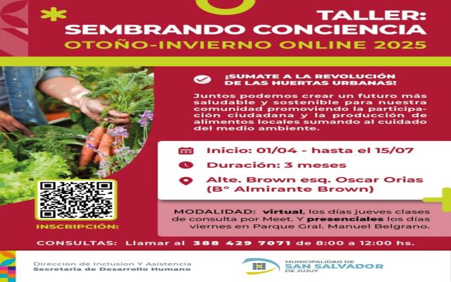 Continúan las inscripciones hasta el miércoles 25 de marzo, para el taller virtual “Sembrando Conciencia”, organizada por la Dirección de Inclusión y Asistencia de la Municipalidad de San Salvador de Jujuy, que tiene como objetivo fomentar la creación de huertas familiares.