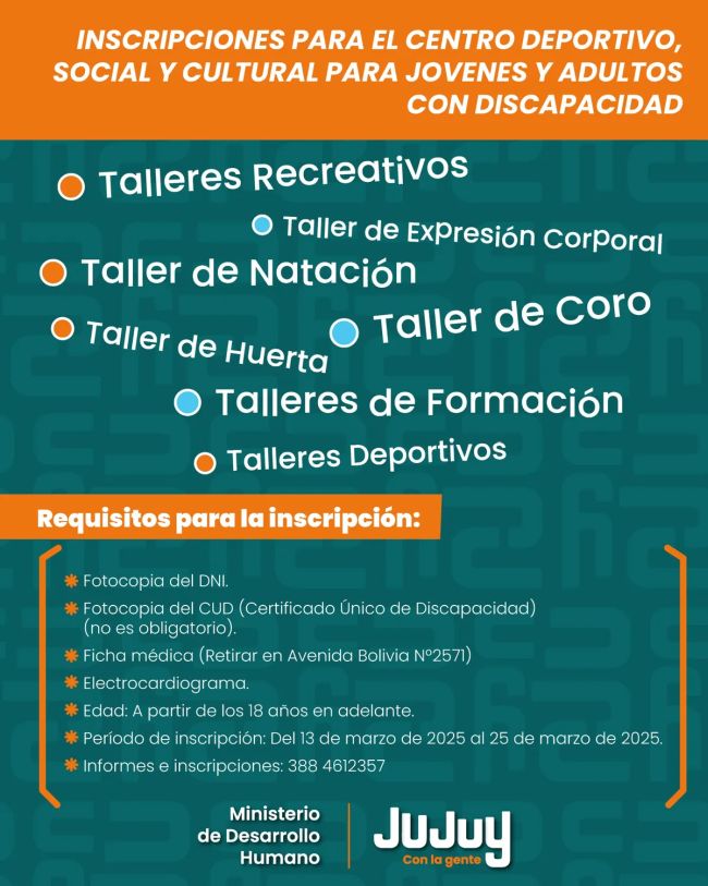 El Ministerio de Desarrollo Humano, a través de la Secretaría de Desarrollo Integral, y la Coordinación de Calidad de Vida invita a Jóvenes y Adultos con Discapacidad a ser parte del Centro Deportivo, Social y Cultural, un espacio diseñado para promover la inclusión, el bienestar y el desarrollo integral de las Personas con Discapacidad.