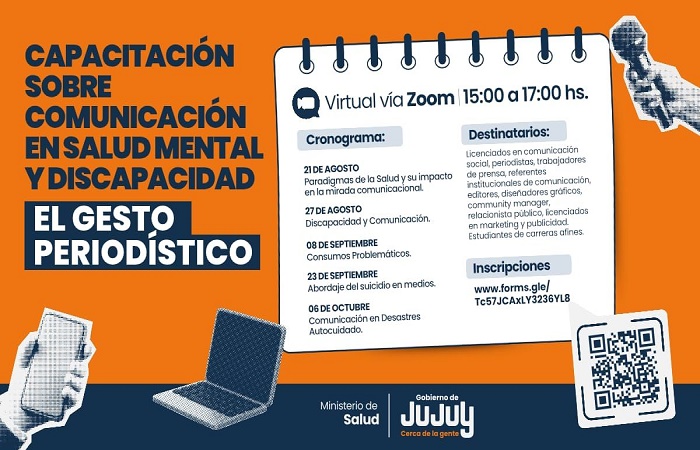 El Ministerio de Salud de Jujuy invita a la capacitación sobre Salud Mental y Discapacidad “El gesto periodístico” destinada a profesionales de Comunicación Social, marketing, publicidad, periodistas, trabajadores de prensa, referentes institucionales de comunicación, editores, diseñadores gráficos, community manager, relacionistas públicos y estudiantes de carreras afines.