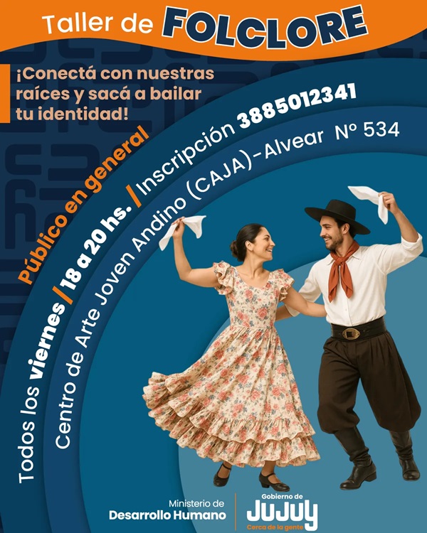 En el marco de sus políticas públicas orientadas a la promoción de derechos, el Ministerio de Desarrollo Humano, a través de la Dirección de Juventud, dependiente de la Secretaría de Niñez, Adolescencia y Familia, llevará adelante un Taller de Folclore gratuito destinado a adolescentes, jóvenes y comunidad en general.