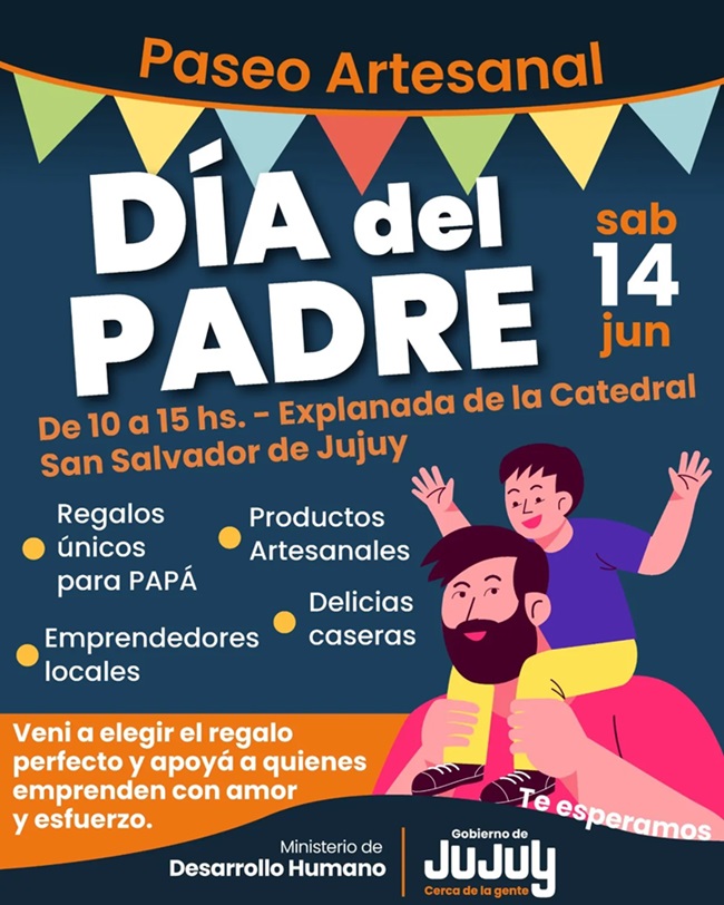 El Ministerio de Desarrollo Humano, a través de la Secretaría de Desarrollo Integral y la Coordinación de Economía Comunitaria, invita a la comunidad a participar del Paseo Artesanal en el marco del Día del Padre, que se realizará el sábado 14 de junio en la explanada de la Iglesia Catedral, ubicada en calle Sarmiento esquina Belgrano, en San Salvador de Jujuy.