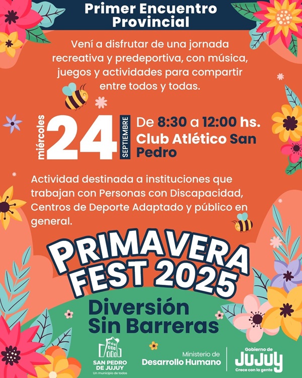 El Ministerio de Desarrollo Humano, a través de la Secretaría de Desarrollo Integral junto al Municipio de San Pedro, invitan a vivir una jornada única de inclusión, deporte y recreación en el Primer Encuentro Provincial – Primavera Fest.