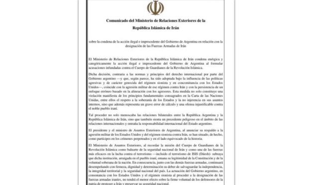 «El Ministerio de Relaciones Exteriores de la República Islámica de Irán condena enérgica y categóricamente la acción ilegal e improcedente del Gobierno de Argentina», arranca el documento oficial, que rechaza las acusaciones contra el Cuerpo de Guardianes de la Revolución Islámica.