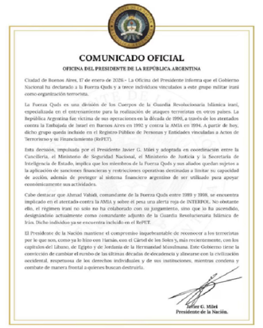 La declaración argentina fue difundida el sábado. Según el comunicado, “la Oficina del Presidente informa de que el Gobierno Nacional ha declarado a la Fuerza Quds y a trece individuos vinculados a este grupo militar iraní como organización terrorista”. El Gobierno argentino responsabilizó a la Fuerza Quds por los atentados perpetrados contra la embajada de Israel en Buenos Aires en 1992 y la Asociación Mutual Israelita Argentina (AMIA) en 1994. Ambos ataques, que no han sido resueltos judicialmente, fueron atribuidos en el comunicado a Irán y al grupo libanés Hezbollah.