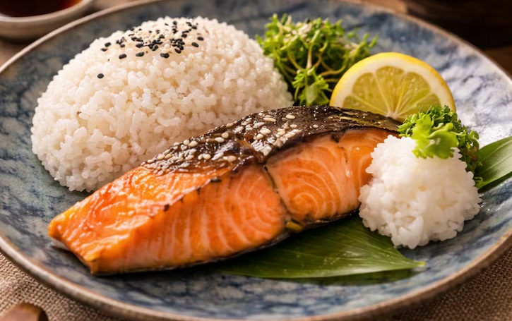 Un almuerzo típico puede incluir sopa con algas y tofu, un plato principal con pescado o carne acompañado de arroz, varias guarniciones de verduras, fruta fresca y leche.