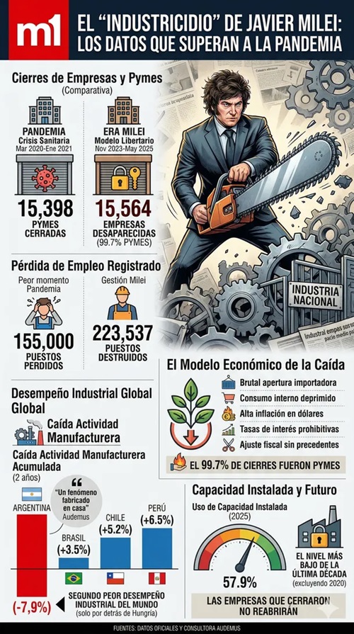 Sin embargo, detrás de esta agresiva cruzada retroactiva contra las medidas sanitarias implementadas durante el Covid-19, se esconde una estadística alarmante y contundente: el actual modelo económico libertario ha resultado ser significativamente más letal para el entramado productivo nacional que la peor crisis sanitaria de la historia moderna.