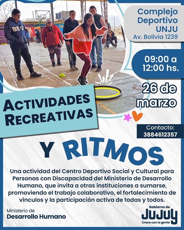 El Ministerio de Desarrollo Humano, a través del Centro Deportivo Social y Cultural para Personas con Discapacidad de la Secretaría de Desarrollo Integral, llevará adelante una jornada de actividades recreativas y ritmos en el Complejo Deportivo de la UNJu, con el objetivo de promover el bienestar y la participación activa de personas con discapacidad.