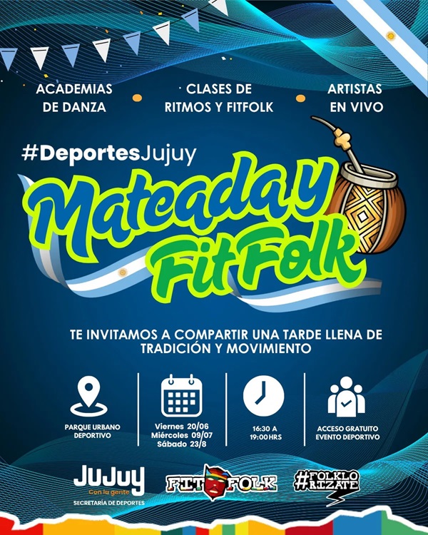 El viernes 20 de junio desde 16:30 a 19:00 horas se desarrollará una nueva jornada de “Mateada y Fit Folk” en el Parque Urbano Deportivo de Alto Comedero, propuesta que conjuga movimiento, diversión, bienestar y tradición dirigida a la familia y a la comunidad en general.
