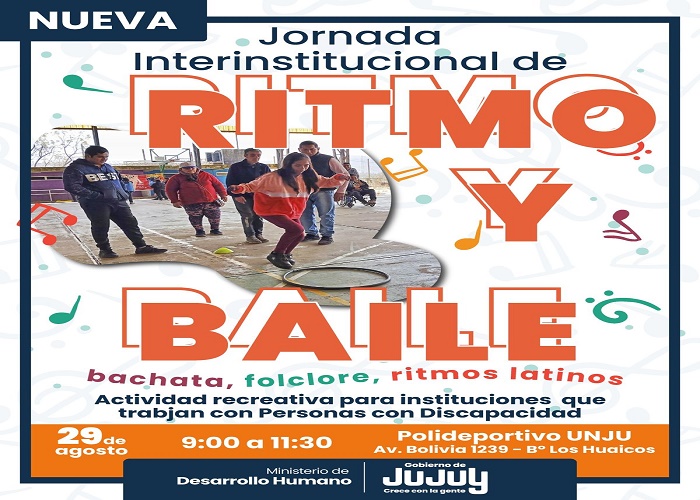 El Ministerio de Desarrollo Humano de Jujuy, a través de la Secretaría de Desarrollo Integral, invita a participar de la Jornada Interinstitucional de Ritmo y Baile, que se llevará a cabo el próximo 29 de agosto de 10 a 12:30 horas en el Polideportivo de la UNJU (Av. Bolivia 1239, B° Los Huaicos, San Salvador).