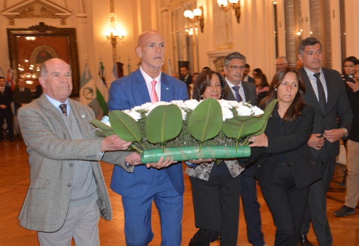 En el inicio del acto las autoridades presentes rindieron homenaje a la Bandera Nacional de la Libertad Civil colocando ante la urna que la guarda ofrendas florares en nombre del Gobierno de la Provincia, Poder Judicial, Colegio de Abogados y Procuradores y CAPSAP.