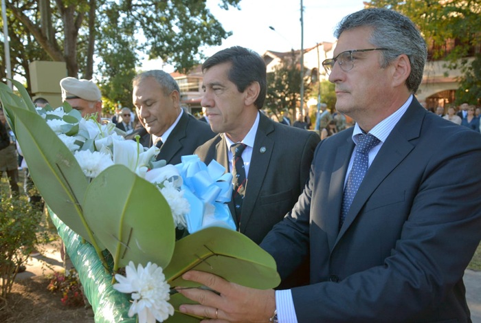Luego se prosiguió con la colocación de ofrendas florales. La primera, en representación del Gobierno de la provincia, las Fuerzas Armadas y el Pueblo de Jujuy, estuvo a cargo del gobernador Carlos Sadir, el vicepresidente de la Suprema Corte de Justicia Dr. Mariano Miranda, el jefe de la Guarnición Militar Jujuy Cnel. Javier Rojo, y el presidente del Centro de Veteranos de Malvinas, Luis Leguina.