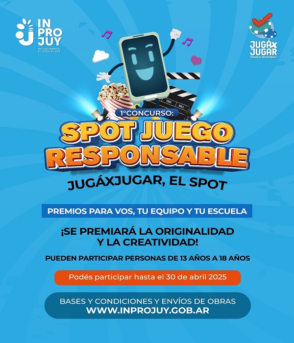El Instituto Provincial de Juegos de Azar de Jujuy (INPROJUY) informa que se extendió el plazo para participar del Concurso de Spot Publicitario sobre “Juego Responsable” dirigido a estudiantes de 13 a 18 años que asisten a colegios de toda la provincia.