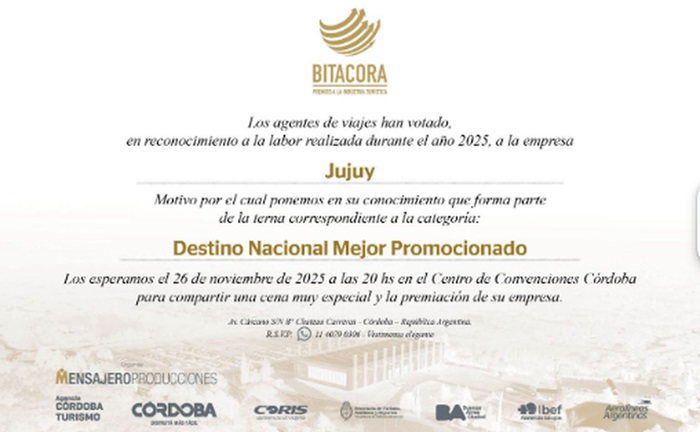 Jujuy fue elegida por los agentes de viajes de todo el país como una de las tres provincias más votadas en la categoría “Destino Nacional Mejor Promocionado” de los Premios Bitácora 2025, uno de los reconocimientos más destacados de la industria turística argentina.