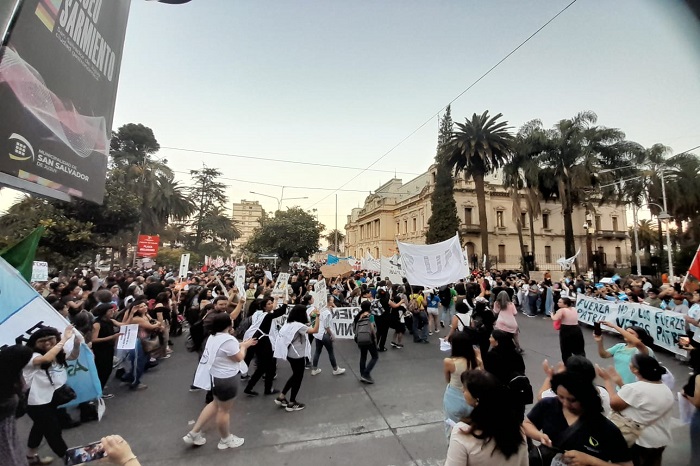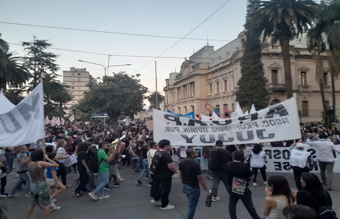 La marcha recorrió cerca de seis cuadras en la ciudad Capital, con cientos de carteles y banderas, recogiendo aplausos de los transeúntes. La bandera de arrastre llevaba la consigna “Salud y educación pública siempre, con los principales referentes de la mesa del Frente Sindical Universitario.