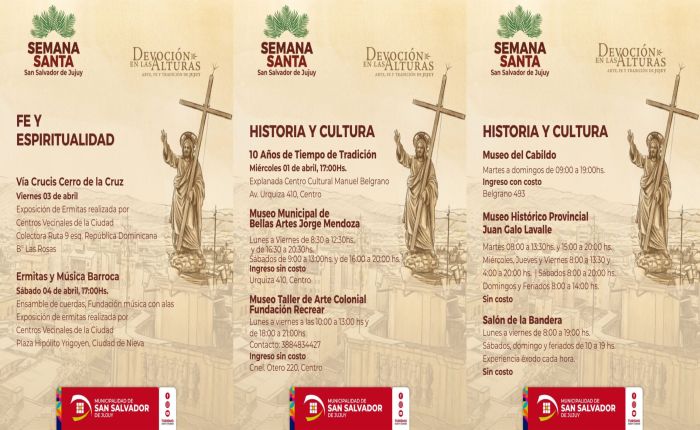La Municipalidad de San Salvador de Jujuy invita a vecinos y visitantes a disfrutar de una amplia agenda de actividades en el marco de Semana Santa, con propuestas destinadas a toda la familia. La programación incluye circuitos de guiados turísticos por distintos puntos emblemáticos de la ciudad, la tradicional exposición de ermitas, además de opciones gastronómicas, culturales y recreativas en diversos escenarios.