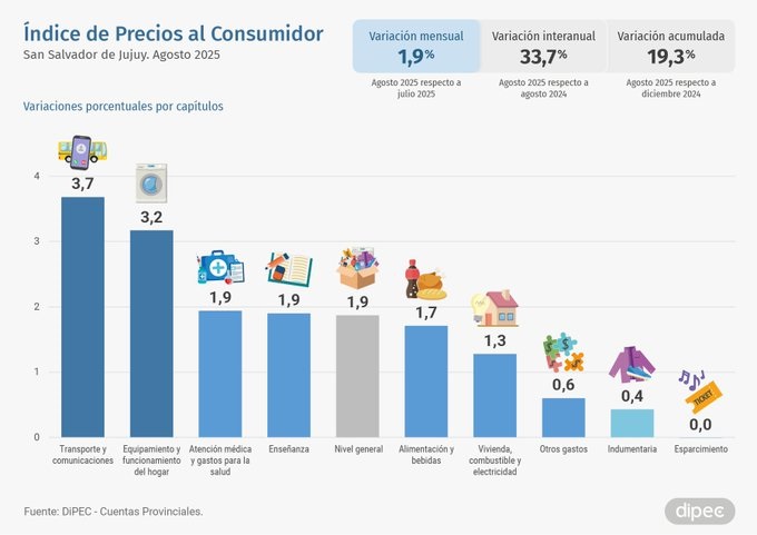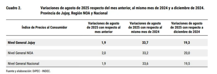 La inflación del mes de agosto en Jujuy fue 1,9%, informó la Dirección provincial de Estadística y Censos (Dipec), mientras en lo que va del año, llegó al 19,3% y la interanual alcanzó un 33,7%.